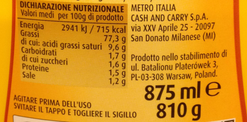 Barcode EAN:   8026924058769 Energy kcal/100g:   715 Satured Fat (per 100g)g:   9.6 Sugar into Carbohydrates (per 100g)g:   1.6 Proteines (per 100g)g:   1.5 Calcium CA/ mg (per 100g)g:   Gluten:   Production type:   Made in:   Poland Price €:   Bought here:   Last update:   2023-04-13 19:16:12 | Brand:   Fat (per 100g)g:   77.3 Carbohydrates (per 100g)g:   1.7 Fiber (per 100g)g:   Salt - Sodium (per 100g)g:   1.2 Ingredients (Indicative):   |