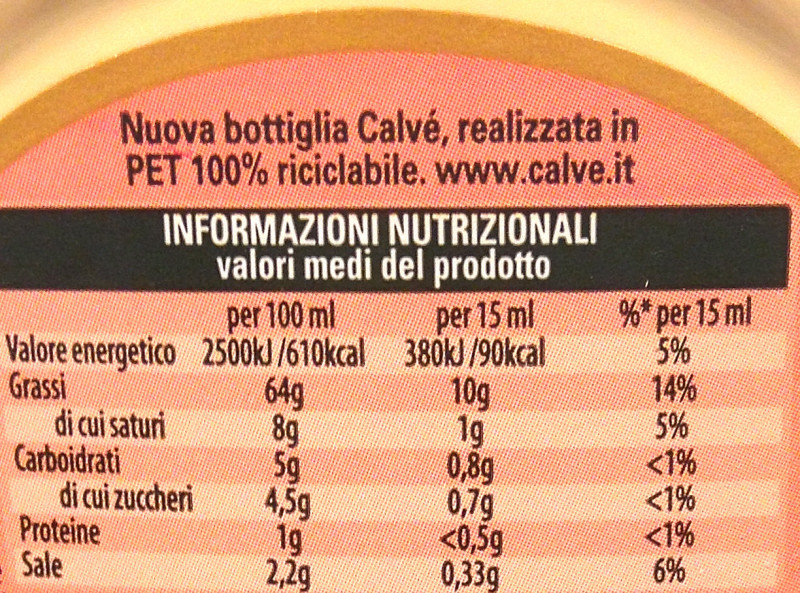 Barcode EAN:   8000810210776 Energy kcal/100g:   610 Satured Fat (per 100g)g:   8 Sugar into Carbohydrates (per 100g)g:   4.5 Proteines (per 100g)g:   1 Calcium CA/ mg (per 100g)g:   Gluten:   Production type:   Made in:   Italy Price €:   Bought here:   Last update:   2017-08-16 17:00:39 | Brand:   Fat (per 100g)g:   64 Carbohydrates (per 100g)g:   5 Fiber (per 100g)g:   Salt - Sodium (per 100g)g:   2.2 Ingredients (Indicative):   |