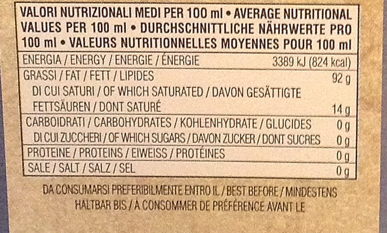 Barcode EAN:   8032529641213 Oil type:   Energy kcal/100ml:   824 Saturated fat g/100ml:   14 Polinsatured fat g/100ml:   Sugars into Carbohydrates g/100ml:   Sodium g/100ml:   Fiber g/100ml:   Price €:   Last update:   2017-08-18 17:58:48 | Brand:   Ingredients:   Fat g/100ml:   92 Monoinsatured fat g/100ml:   Carbohydrates g/100ml:   Proteines gr/100ml:   Cholesterol g/100ml:   Made in:   Italy Bought here:   |