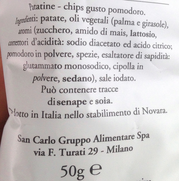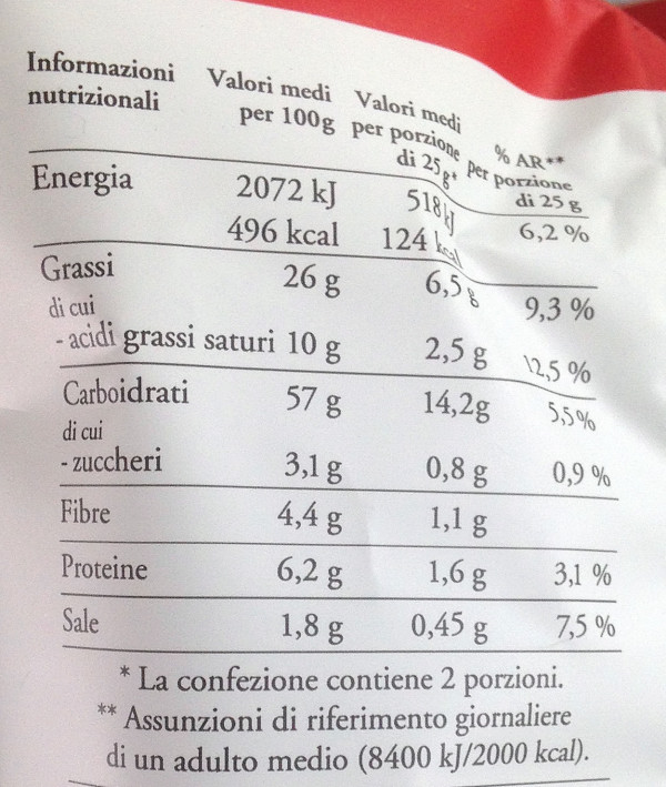 Barcode EAN:   8003130129520 Energy kcal/100g:   496 Satured Fat (per 100g)g:   10 Sugar into Carbohydrates (per 100g)g:   3.1 Proteines (per 100g)g:   6.2 Calcium CA/ mg (per 100g)g:   Gluten:   Production type:   Made in:   Italy Price €:   Bought here:   Last update:   2017-08-19 17:43:17 | Brand:   Fat (per 100g)g:   26 Carbohydrates (per 100g)g:   57 Fiber (per 100g)g:   4.4 Salt - Sodium (per 100g)g:   1.8 Ingredients (Indicative):   |