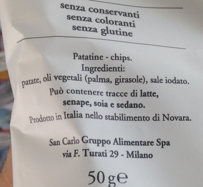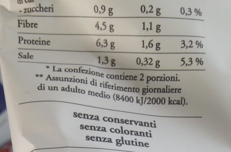Barcode EAN:   8003130129544 Energy kcal/100g:   502 Satured Fat (per 100g)g:   10.6 Sugar into Carbohydrates (per 100g)g:   0.9 Proteines (per 100g)g:   6.3 Calcium CA/ mg (per 100g)g:   Gluten:   Production type:   Made in:   Italy Price €:   Bought here:   Last update:   2017-08-20 17:28:43 | Brand:   Fat (per 100g)g:   27 Carbohydrates (per 100g)g:   56.3 Fiber (per 100g)g:   4.5 Salt - Sodium (per 100g)g:   1.3 Ingredients (Indicative):   |