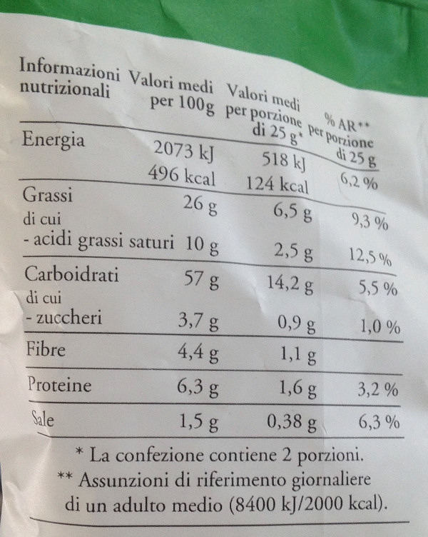 Barcode EAN:   8003130129520 Energy kcal/100g:   496 Satured Fat (per 100g)g:   10 Sugar into Carbohydrates (per 100g)g:   3.7 Proteines (per 100g)g:   6.3 Calcium CA/ mg (per 100g)g:   Gluten:   Production type:   Made in:   Italy Price €:   Bought here:   Last update:   2017-08-20 19:08:01 | Brand:   Fat (per 100g)g:   26 Carbohydrates (per 100g)g:   57 Fiber (per 100g)g:   4.4 Salt - Sodium (per 100g)g:   1.5 Ingredients (Indicative):   |