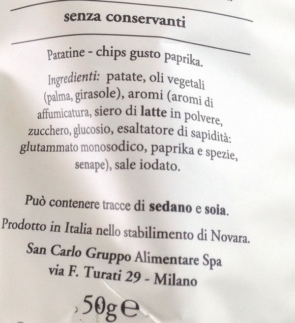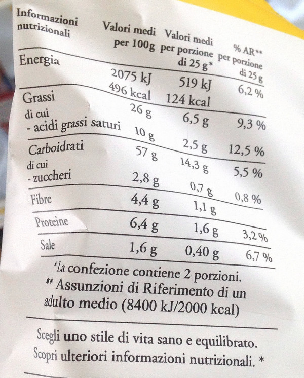 Barcode EAN:   8003130129520 Energy kcal/100g:   496 Satured Fat (per 100g)g:   10 Sugar into Carbohydrates (per 100g)g:   2.8 Proteines (per 100g)g:   6.4 Calcium CA/ mg (per 100g)g:   Gluten:   Production type:   Made in:   Italy Price €:   Bought here:   Last update:   2017-08-21 16:54:13 | Brand:   Fat (per 100g)g:   26 Carbohydrates (per 100g)g:   57 Fiber (per 100g)g:   4.4 Salt - Sodium (per 100g)g:   1.6 Ingredients (Indicative):   |