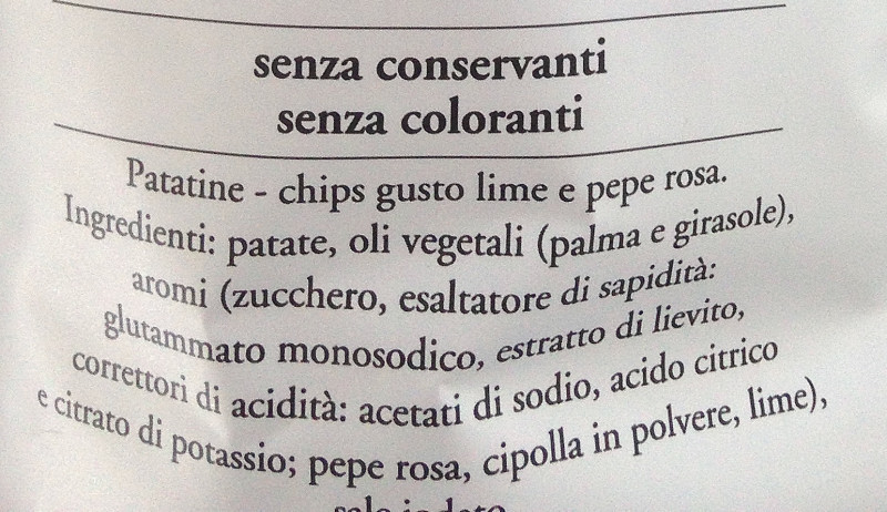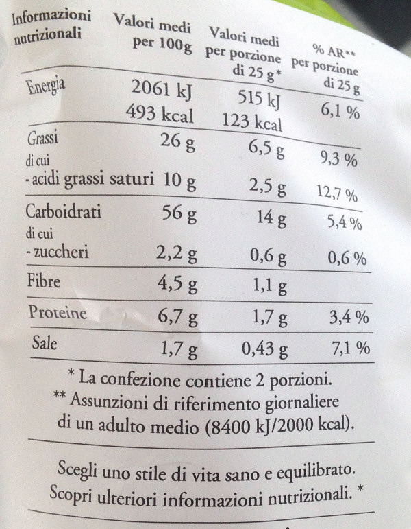 Barcode EAN:   8003130129520 Energy kcal/100g:   493 Satured Fat (per 100g)g:   10 Sugar into Carbohydrates (per 100g)g:   2.2 Proteines (per 100g)g:   6.7 Calcium CA/ mg (per 100g)g:   Gluten:   Production type:   Made in:   Italy Price €:   Bought here:   Last update:   2017-08-21 17:22:11 | Brand:   Fat (per 100g)g:   26 Carbohydrates (per 100g)g:   56 Fiber (per 100g)g:   4.5 Salt - Sodium (per 100g)g:   1.7 Ingredients (Indicative):   |