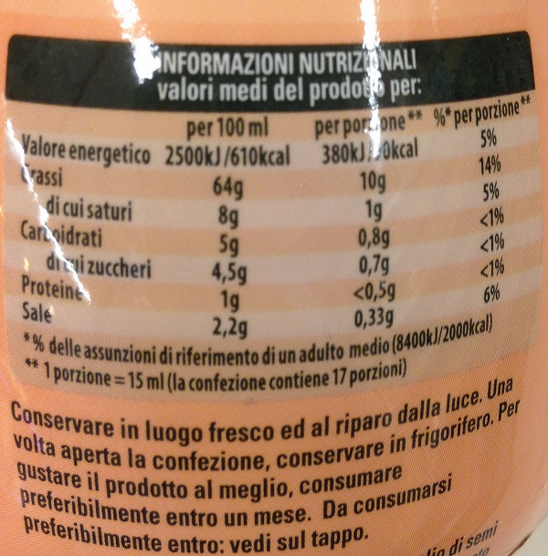 Barcode EAN:   8000810550360 Energy kcal/100g:   610 Satured Fat (per 100g)g:   8 Sugar into Carbohydrates (per 100g)g:   4.5 Proteines (per 100g)g:   1 Calcium CA/ mg (per 100g)g:   Gluten:   Production type:   Made in:   Italy Price €:   Bought here:   Last update:   2017-08-25 15:49:05 | Brand:   Fat (per 100g)g:   64 Carbohydrates (per 100g)g:   5 Fiber (per 100g)g:   Salt - Sodium (per 100g)g:   2.2 Ingredients (Indicative):   |