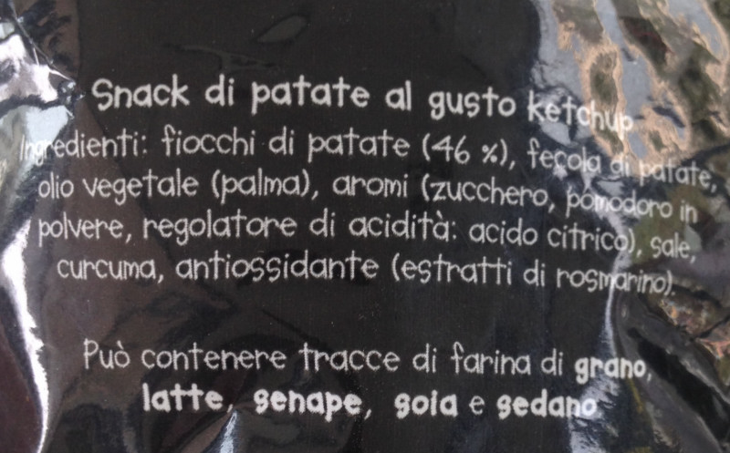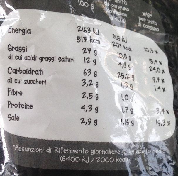 Barcode EAN:   8003130139925 Energy kcal/100g:   517 Satured Fat (per 100g)g:   12 Sugar into Carbohydrates (per 100g)g:   3.2 Proteines (per 100g)g:   4.3 Calcium CA/ mg (per 100g)g:   Gluten:   Production type:   Made in:   Italy Price €:   Bought here:   Last update:   2017-08-26 13:03:58 | Brand:   Fat (per 100g)g:   27 Carbohydrates (per 100g)g:   63 Fiber (per 100g)g:   2.5 Salt - Sodium (per 100g)g:   2.9 Ingredients (Indicative):   |