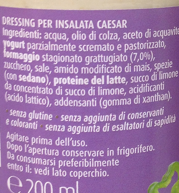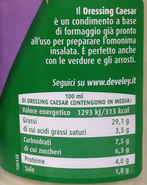 Barcode EAN:   4006824003865 Energy kcal/100g:   313 Satured Fat (per 100g)g:   3.5 Sugar into Carbohydrates (per 100g)g:   6.3 Proteines (per 100g)g:   4 Calcium CA/ mg (per 100g)g:   Gluten:   Production type:   Made in:   Italy Price €:   Bought here:   Last update:   2017-08-26 18:02:12 | Brand:   Fat (per 100g)g:   29.1 Carbohydrates (per 100g)g:   7.5 Fiber (per 100g)g:   Salt - Sodium (per 100g)g:   1.8 Ingredients (Indicative):   |