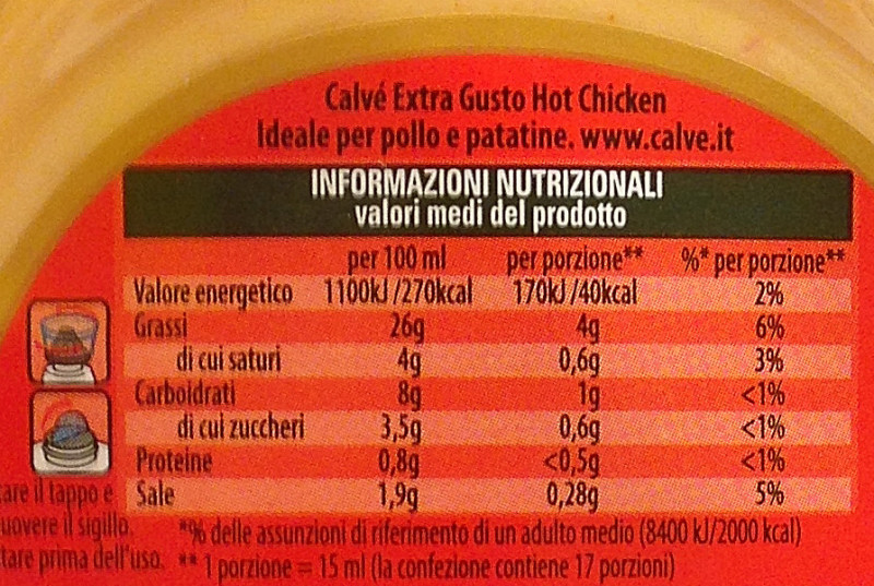 Barcode EAN:   8712100403736 Energy kcal/100g:   270 Satured Fat (per 100g)g:   4 Sugar into Carbohydrates (per 100g)g:   3.5 Proteines (per 100g)g:   0.8 Calcium CA/ mg (per 100g)g:   Gluten:   Production type:   Made in:   Italy Price €:   Bought here:   Last update:   2017-08-26 19:39:59 | Brand:   Fat (per 100g)g:   26 Carbohydrates (per 100g)g:   8 Fiber (per 100g)g:   Salt - Sodium (per 100g)g:   1.9 Ingredients (Indicative):   |