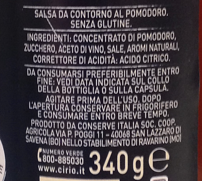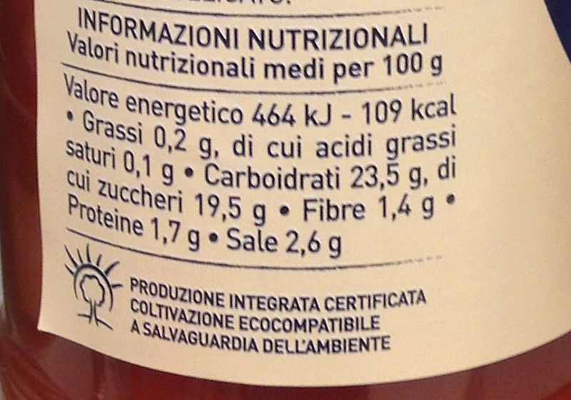 Barcode EAN:   80160281 Energy kcal/100g:   109 Satured Fat (per 100g)g:   0.1 Sugar into Carbohydrates (per 100g)g:   19.5 Proteines (per 100g)g:   1.7 Calcium CA/ mg (per 100g)g:   Gluten:   Production type:   Made in:   Italy Price €:   Bought here:   Last update:   2017-08-27 15:41:06 | Brand:   Fat (per 100g)g:   0.2 Carbohydrates (per 100g)g:   23.5 Fiber (per 100g)g:   1.4 Salt - Sodium (per 100g)g:   2.6 Ingredients (Indicative):   |