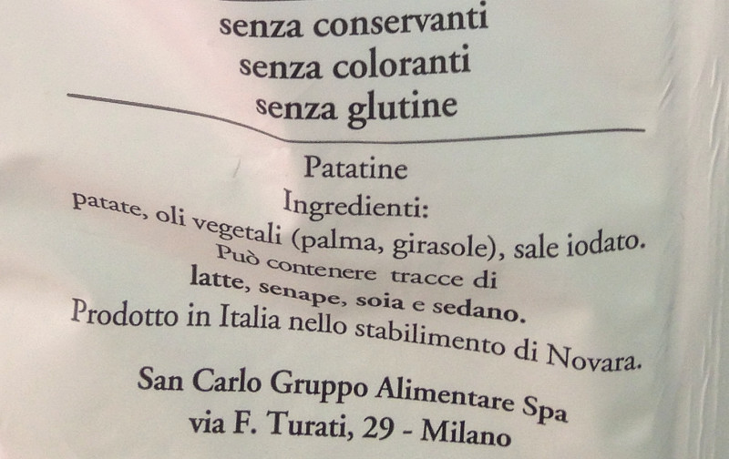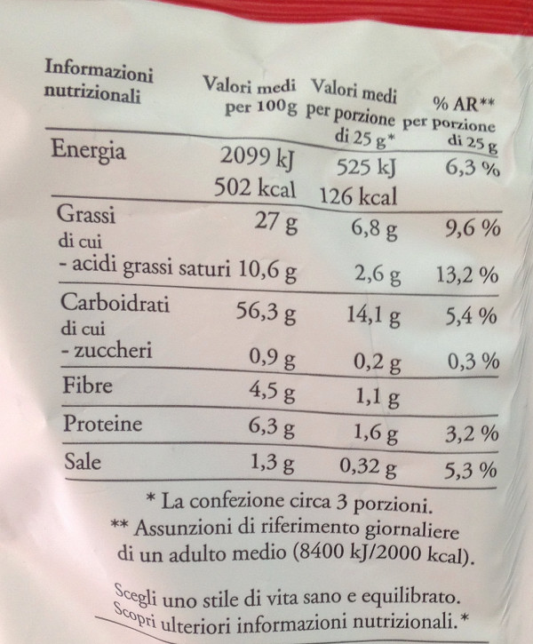 Barcode EAN:   8003130141218 Energy kcal/100g:   502 Satured Fat (per 100g)g:   10.6 Sugar into Carbohydrates (per 100g)g:   0.9 Proteines (per 100g)g:   6.3 Calcium CA/ mg (per 100g)g:   Gluten:   Production type:   Made in:   Italy Price €:   Bought here:   Last update:   2017-09-02 09:22:10 | Brand:   Fat (per 100g)g:   27 Carbohydrates (per 100g)g:   56.3 Fiber (per 100g)g:   4.5 Salt - Sodium (per 100g)g:   1.3 Ingredients (Indicative):   |