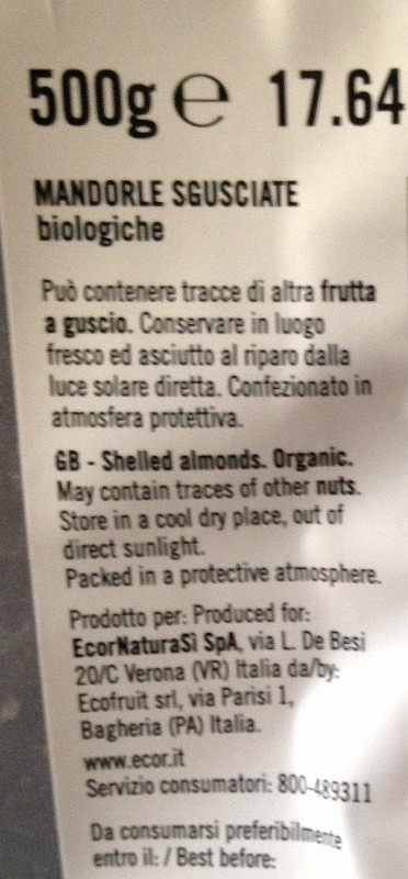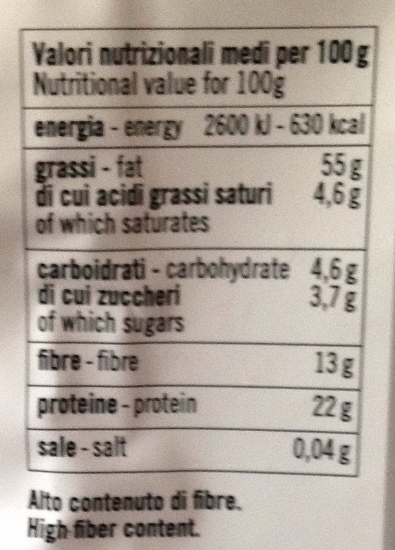 Barcode EAN:   8019010339125 Energy kcal/100g:   630 Satured Fat (per 100g)g:   4.6 Sugar into Carbohydrates (per 100g)g:   3.7 Proteines (per 100g)g:   22 Calcium CA/ mg (per 100g)g:   Gluten:   Made in:   Italy Bought here:   Last update:   2017-09-03 10:08:04 | Brand:   Fat (per 100g)g:   55 Carbohydrates (per 100g)g:   4.6 Fiber (per 100g)g:   13 Salt - Sodium (per 100g)g:   0.04 Ingredients (Indicative):   Production type:   Price €:   |