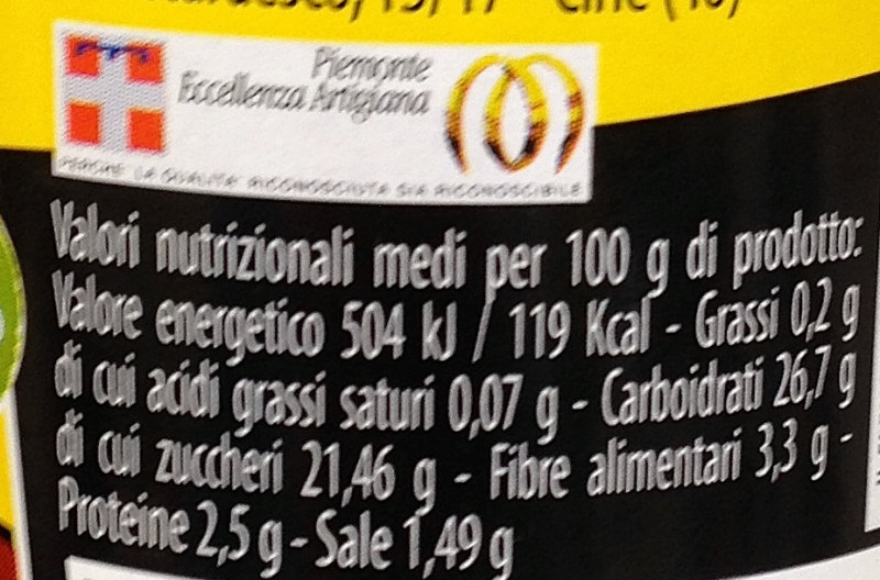Barcode EAN:   8024336001977 Energy kcal/100g:   119 Satured Fat (per 100g)g:   0.07 Sugar into Carbohydrates (per 100g)g:   21.46 Proteines (per 100g)g:   2.5 Calcium CA/ mg (per 100g)g:   Gluten:   Production type:   Made in:   Italy Price €:   Bought here:   Last update:   2017-09-13 19:10:46 | Brand:   Fat (per 100g)g:   0.2 Carbohydrates (per 100g)g:   26.7 Fiber (per 100g)g:   3.3 Salt - Sodium (per 100g)g:   1.49 Ingredients (Indicative):   |