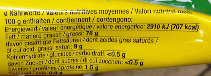 Barcode EAN:   7610405080762 Energy kcal/100g:   707 Satured Fat (per 100g)g:   9 Sugar into Carbohydrates (per 100g)g:   0.04 Proteines (per 100g)g:   1.5 Calcium CA/ mg (per 100g)g:   Gluten:   Production type:   Made in:   Switzerland Price €:   Bought here:   Last update:   2017-09-14 16:54:32 | Brand:   Fat (per 100g)g:   78 Carbohydrates (per 100g)g:   0.04 Fiber (per 100g)g:   Salt - Sodium (per 100g)g:   0.9 Ingredients (Indicative):   |