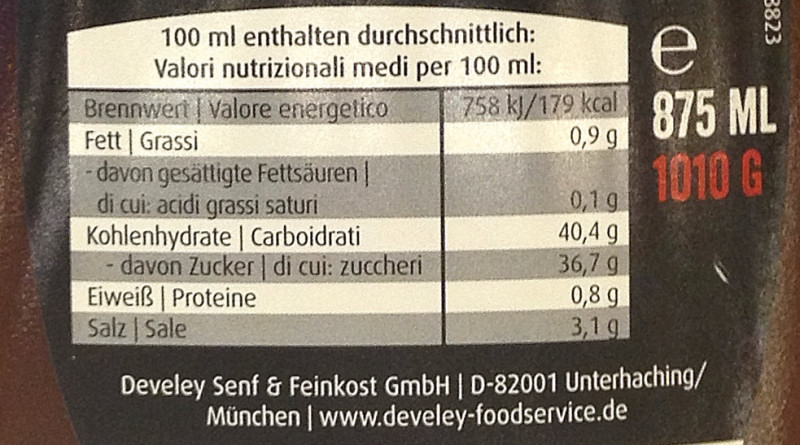 Barcode EAN:   4006824002868 Energy kcal/100g:   179 Satured Fat (per 100g)g:   0.1 Sugar into Carbohydrates (per 100g)g:   36.7 Proteines (per 100g)g:   0.8 Calcium CA/ mg (per 100g)g:   Gluten:   Production type:   Made in:   Germany Price €:   Bought here:   Last update:   2017-09-27 18:48:28 | Brand:   Fat (per 100g)g:   0.9 Carbohydrates (per 100g)g:   40.4 Fiber (per 100g)g:   Salt - Sodium (per 100g)g:   3.1 Ingredients (Indicative):   |