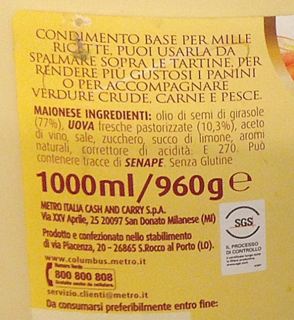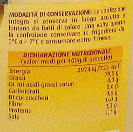 Barcode EAN:   8026924004056 Energy kcal/100g:   723 Satured Fat (per 100g)g:   8 Sugar into Carbohydrates (per 100g)g:   0.6 Proteines (per 100g)g:   1.3 Calcium CA/ mg (per 100g)g:   Gluten:   Production type:   Made in:   Italy Price €:   Bought here:   Last update:   2017-09-28 18:42:00 | Brand:   Fat (per 100g)g:   79.5 Carbohydrates (per 100g)g:   0.6 Fiber (per 100g)g:   Salt - Sodium (per 100g)g:   1.1 Ingredients (Indicative):   |