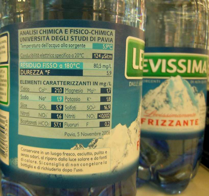 Barcode EAN:   0000080015536 Source altitude mt:   1848 Temperature at the source °C:   4.9 Hardness:   5.7 Elecrical power ms/cm 20/25°:   118 Nitrate NO3mg/l:   1.3 Clorure Clmg/l:   Sodium Na1mg/l:   2.1 Magnesium Mg2mg/l:   1.7 Fluorine Fmg/l:   0.2 Free carbon dioxide at the source CO2mg/ll:   Price €: