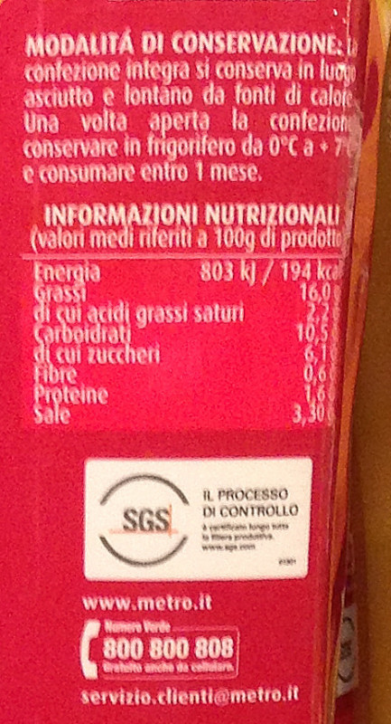 Barcode EAN:   8026924018992 Energy kcal/100g:   194 Satured Fat (per 100g)g:   2.2 Sugar into Carbohydrates (per 100g)g:   6.1 Proteines (per 100g)g:   1.6 Calcium CA/ mg (per 100g)g:   Gluten:   Production type:   Made in:   Italy Price €:   Bought here:   Last update:   2017-09-30 17:03:26 | Brand:   Fat (per 100g)g:   16 Carbohydrates (per 100g)g:   10.5 Fiber (per 100g)g:   0.6 Salt - Sodium (per 100g)g:   3.3 Ingredients (Indicative):   |