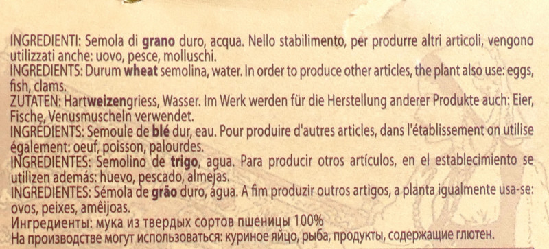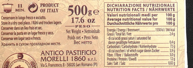 Barcode EAN:   8009167012248 Energy kcal/100g:   366 Satured Fat (per 100g)g:   0.4 Sugar into Carbohydrates (per 100g)g:   3.9 Proteines (per 100g)g:   Calcium CA/ mg (per 100g)g:   0.02 Gluten:   Production type:   Made in:   Italy Bought here:   Last update:   2017-10-06 09:30:03 | Brand:   Fat (per 100g)g:   24 Carbohydrates (per 100g)g:   72 Fiber (per 100g)g:   3 Salt - Sodium (per 100g)g:   12 Ingredients (Indicative):   Price €:   Cooking time - min.:   11 |