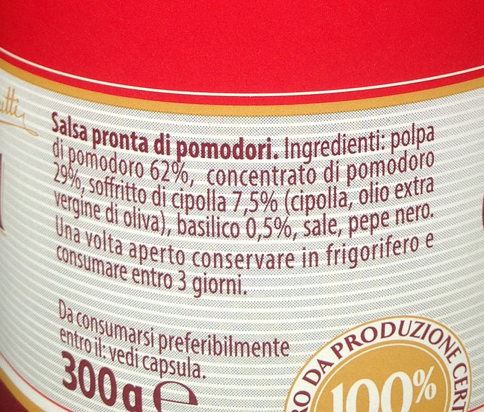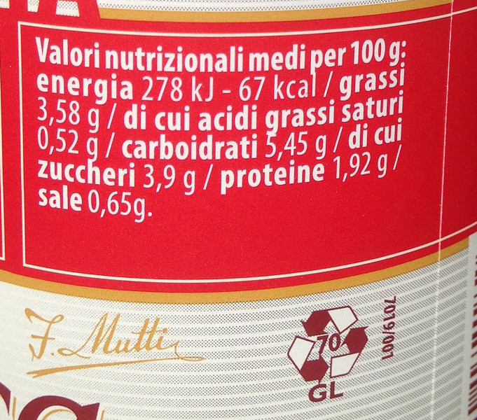 Barcode EAN:   8005110172182 Energy kcal/100g:   67 Satured Fat (per 100g)g:   0.52 Sugar into Carbohydrates (per 100g)g:   3.9 Proteines (per 100g)g:   1.92 Calcium CA/ mg (per 100g)g:   Gluten:   Production type:   Made in:   Italy Price €:   Bought here:   Last update:   2017-10-08 17:20:57 | Brand:   Fat (per 100g)g:   3.58 Carbohydrates (per 100g)g:   5.45 Fiber (per 100g)g:   Salt - Sodium (per 100g)g:   0.65 Ingredients (Indicative):   |