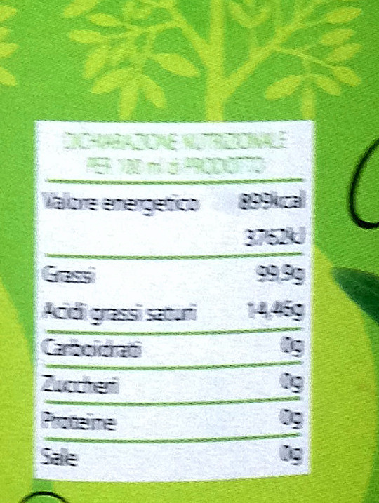 Barcode EAN:   8032642542015 Oil type:   Energy kcal/100ml:   899 Saturated fat g/100ml:   14.46 Polinsatured fat g/100ml:   Sugars into Carbohydrates g/100ml:   Sodium g/100ml:   Fiber g/100ml:   Price €:   Last update:   2017-11-08 17:05:32 | Brand:   Ingredients:   Fat g/100ml:   99.9 Monoinsatured fat g/100ml:   Carbohydrates g/100ml:   Proteines gr/100ml:   Cholesterol g/100ml:   Made in:   Italy Bought here:   |