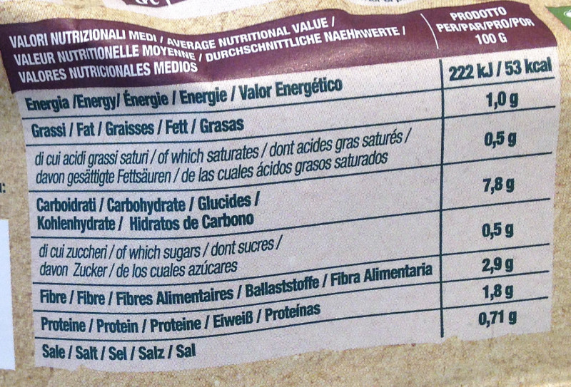 Barcode EAN:   8055118489591 Energy kcal/100g:   53 Satured Fat (per 100g)g:   0.5 Sugar into Carbohydrates (per 100g)g:   0.5 Proteines (per 100g)g:   1.8 Calcium CA/ mg (per 100g)g:   Gluten:   Production type:   Made in:   Italy Price €:   Bought here:   Last update:   2017-11-08 18:43:00 | Brand:   Fat (per 100g)g:   1 Carbohydrates (per 100g)g:   7.8 Fiber (per 100g)g:   2.9 Salt - Sodium (per 100g)g:   0.71 Ingredients (Indicative):   |