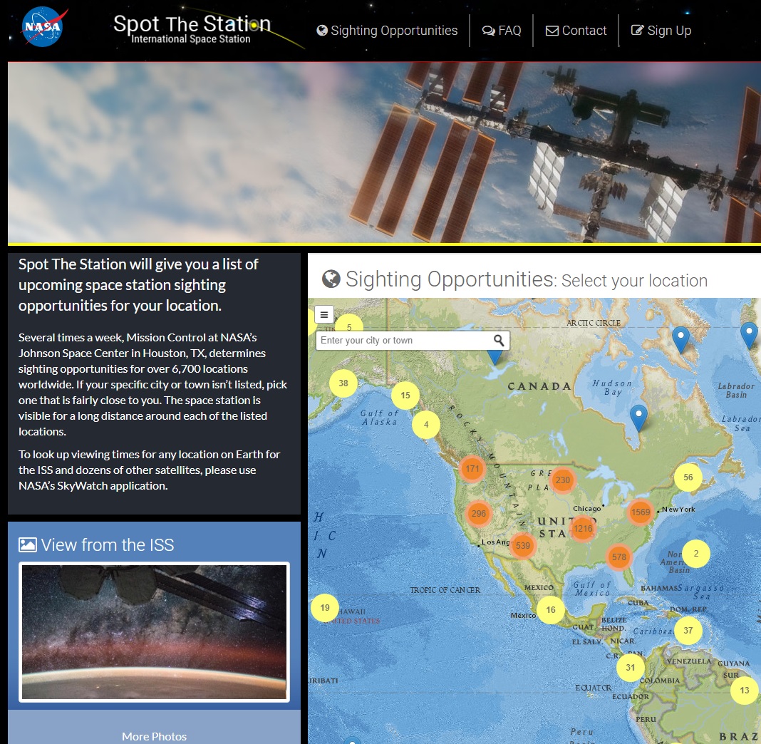 This section of the "Spot The Station" website offers calculations of sightings for over 6,700 locations worldwide, based on data from NASA's Johnson Space Center Mission Control. Learn more.