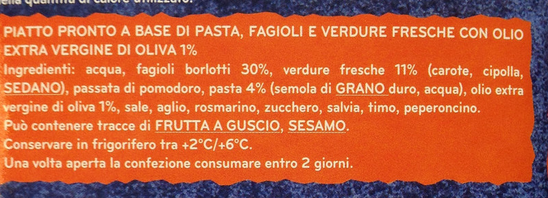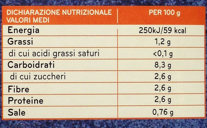 Barcode EAN:   8055118487665 Energy kcal/100g:   59 Satured Fat (per 100g)g:   0.09 Sugar into Carbohydrates (per 100g)g:   2.6 Proteines (per 100g)g:   2.6 Calcium CA/ mg (per 100g)g:   Gluten:   Production type:   Made in:   Italy Price €:   Bought here:   Last update:   2018-02-13 11:48:58 | Brand:   Fat (per 100g)g:   1.2 Carbohydrates (per 100g)g:   8.3 Fiber (per 100g)g:   2.6 Salt - Sodium (per 100g)g:   0.76 Ingredients (Indicative):   |