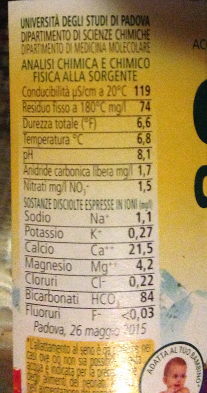 Barcode EAN:   80164586 Source altitude mt:   1370 Temperature at the source °C:   6.8 Hardness:   6.6 Elecrical power ms/cm 20/25°:   119 Nitrate NO3mg/l:   1.5 Clorure Clmg/l:   0.22 Sodium Na1mg/l:   1.1 Magnesium Mg2mg/l:   4.2 Fluorine Fmg/l:   0.02 Free carbon dioxide at the source CO2mg/ll:   1.7 Price €:   Last update:   2018-08-20 17:01:09 | Brand:   Year analisys:   2015 Total dissolved solids mg/L at 180°:   74 pH at source:   8.1 Oxidability O2mg/l:   Bicarbonate HCO3mg/l:   84 Sulphate SO4mg/l:   Calcium Ca2mg/l:   21.5 Potassium K1mg/l:   0.27 Silica SiO2mg/l:   Country:   Italy Bought here:   |