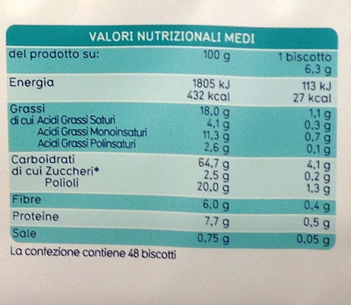 Barcode EAN:   8002190001807 Energy kcal/100g:   432 Satured Fat (per 100g)g:   4.1 Sugar into Carbohydrates (per 100g)g:   2.5 Proteines (per 100g)g:   7.7 Calcium CA/ mg (per 100g)g:   Gluten:   Production type:   Made in:   Italy Price €:   Bought here:   Last update:   2018-03-27 17:43:58 | Brand:   Fat (per 100g)g:   18 Carbohydrates (per 100g)g:   64.7 Fiber (per 100g)g:   6 Salt - Sodium (per 100g)g:   0.75 Ingredients (Indicative):   |