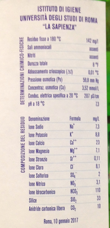 Barcode EAN:   8015962000021 Source altitude mt:   590 Temperature at the source °C:   Hardness:   Elecrical power ms/cm 20/25°:   207 Nitrate NO3mg/l:   3.1 Clorure Clmg/l:   8.1 Sodium Na1mg/l:   7.3 Magnesium Mg2mg/l:   7.1 Fluorine Fmg/l:   Free carbon dioxide at the source CO2mg/ll:   10 Price €:   Last update:   2021-02-12 16:36:04 | Brand:   Year analisys:   2017 Total dissolved solids mg/L at 180°:   142 pH at source:   7.3 Oxidability O2mg/l:   Bicarbonate HCO3mg/l:   110 Sulphate SO4mg/l:   2 Calcium Ca2mg/l:   23 Potassium K1mg/l:   8.8 Silica SiO2mg/l:   33 Country:   Italy Bought here: