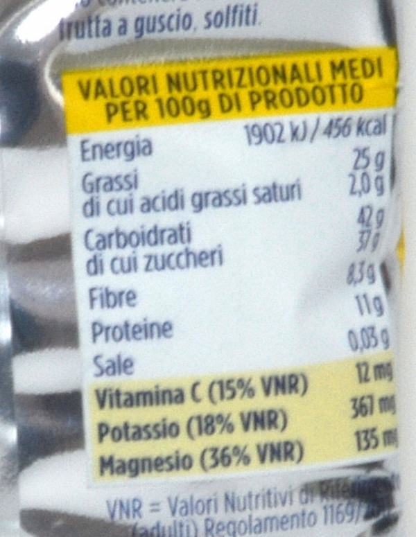 Barcode EAN:   8028618015065 Energy kcal/100g:   456 Satured Fat (per 100g)g:   2 Sugar into Carbohydrates (per 100g)g:   37 Proteines (per 100g)g:   11 Calcium CA/ mg (per 100g)g:   Gluten:   Production type:   Made in:   Italy Price €:   Bought here:   Last update:   2018-06-20 16:29:22 | Brand:   Fat (per 100g)g:   25 Carbohydrates (per 100g)g:   42 Fiber (per 100g)g:   8.3 Salt - Sodium (per 100g)g:   0.03 Ingredients (Indicative):   |