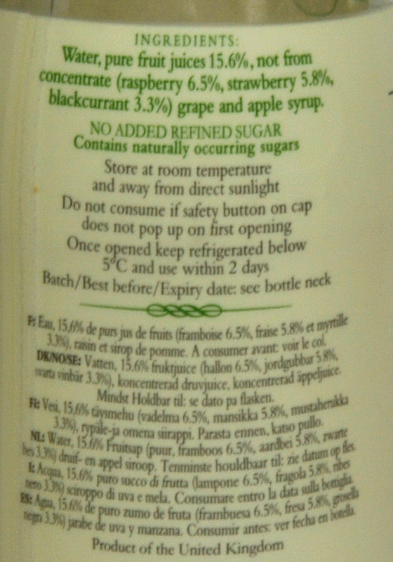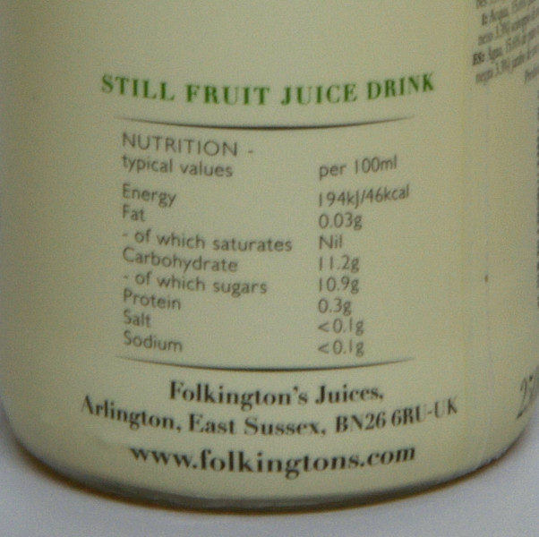 Barcode EAN:   5060042981236 Calories Kcal 100 ml:   46 Saturated fat:   Sugars (in the Carbohydrates):   10.9 Proteins per 100 ml:   0.3 Ingredients:   Last update:   2018-06-20 17:41:36 | Brand:   Fat per 100 ml:   0.03 Carbohydrates per 100 ml:   11.2 Fiber per 100 ml:   Sodium per 100 ml:   0.09 Made in:   United Kingdom Production type:   Price €:   Bought here:   |
