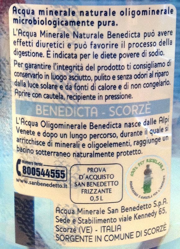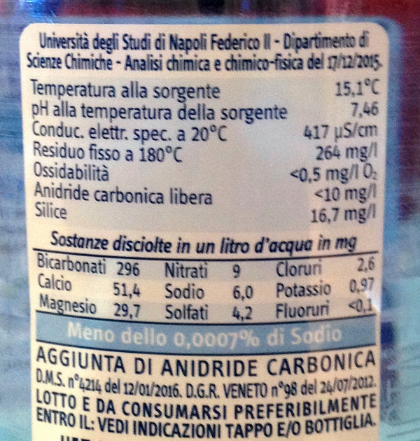 Barcode EAN:   80007838 Source altitude mt:   Temperature at the source °C:   15.1 Hardness:   Elecrical power ms/cm 20/25°:   417 Nitrate NO3mg/l:   9 Clorure Clmg/l:   2.6 Sodium Na1mg/l:   6 Magnesium Mg2mg/l:   29.7 Fluorine Fmg/l:   0.09 Free carbon dioxide at the source CO2mg/ll:   9 Price €:   Last update:   2018-07-15 17:36:37 | Brand:   Year analisys:   2015 Total dissolved solids mg/L at 180°:   264 pH at source:   7.46 Oxidability O2mg/l:   Bicarbonate HCO3mg/l:   296 Sulphate SO4mg/l:   4.2 Calcium Ca2mg/l:   51.4 Potassium K1mg/l:   0.97 Silica SiO2mg/l:   16.7 Country:   Italy Bought here:   |