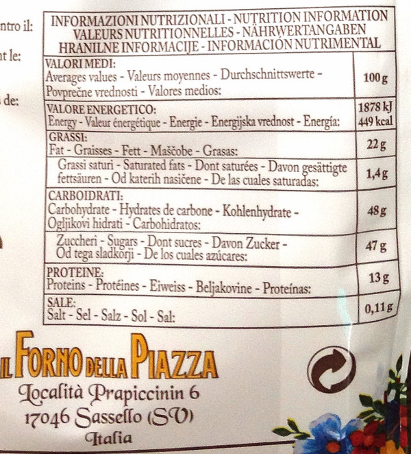 Barcode EAN:   8001311500120 Energy kcal/100g:   449 Satured Fat (per 100g)g:   1.4 Sugar into Carbohydrates (per 100g)g:   47 Proteines (per 100g)g:   13 Calcium CA/ mg (per 100g)g:   Gluten:   Production type:   Made in:   Italy Price €:   Bought here:   Last update:   2018-07-29 19:20:00 | Brand:   Fat (per 100g)g:   22 Carbohydrates (per 100g)g:   48 Fiber (per 100g)g:   Salt - Sodium (per 100g)g:   0.11 Ingredients (Indicative):   |