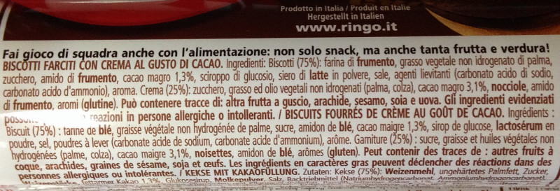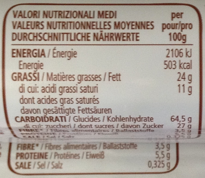 Barcode EAN:   8013355999471 Energy kcal/100g:   503 Satured Fat (per 100g)g:   3.8 Sugar into Carbohydrates (per 100g)g:   27 Proteines (per 100g)g:   5.5 Calcium CA/ mg (per 100g)g:   Gluten:   Production type:   Made in:   Italy Price €:   Bought here:   Last update:   2018-08-16 09:39:45 | Brand:   Fat (per 100g)g:   24 Carbohydrates (per 100g)g:   64.5 Fiber (per 100g)g:   3.5 Salt - Sodium (per 100g)g:   0.325 Ingredients (Indicative):   |