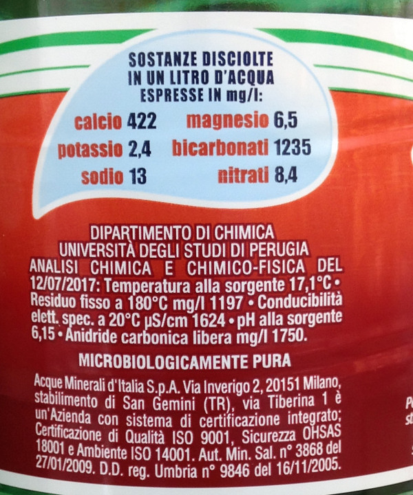 Barcode EAN:   80603764 Source altitude mt:   Temperature at the source °C:   17.1 Hardness:   Elecrical power ms/cm 20/25°:   1624 Nitrate NO3mg/l:   8.4 Clorure Clmg/l:   Sodium Na1mg/l:   13 Magnesium Mg2mg/l:   6.5 Fluorine Fmg/l:   Free carbon dioxide at the source CO2mg/ll:   1750 Price €:   Last update:   2018-08-29 15:23:43 | Brand:   Year analisys:   2017 Total dissolved solids mg/L at 180°:   1197 pH at source:   6.15 Oxidability O2mg/l:   Bicarbonate HCO3mg/l:   1235 Sulphate SO4mg/l:   Calcium Ca2mg/l:   422 Potassium K1mg/l:   2.4 Silica SiO2mg/l:   Country:   Italy Bought here:   |
