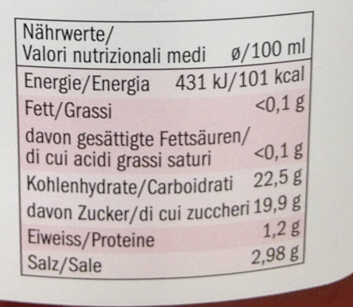 Barcode EAN:   20529932 Energy kcal/100g:   101 Satured Fat (per 100g)g:   0.09 Sugar into Carbohydrates (per 100g)g:   19.9 Proteines (per 100g)g:   1.2 Calcium CA/ mg (per 100g)g:   Gluten:   Production type:   Made in:   Germany Price €:   Bought here:   Last update:   2018-08-30 17:09:18 | Brand:   Fat (per 100g)g:   0.09 Carbohydrates (per 100g)g:   22.5 Fiber (per 100g)g:   Salt - Sodium (per 100g)g:   2.98 Ingredients (Indicative):   |
