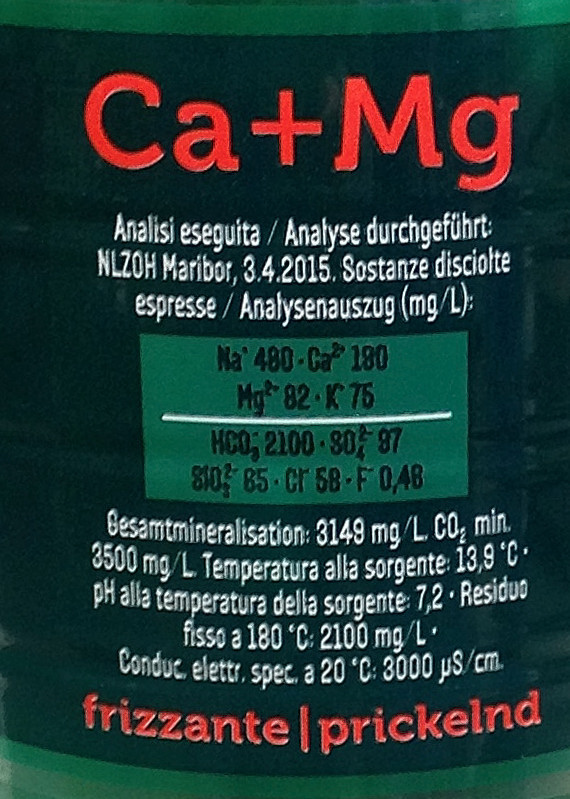 Barcode EAN:   3830000620437 Source altitude mt:   Temperature at the source °C:   13.9 Hardness:   Elecrical power ms/cm 20/25°:   3000 Nitrate NO3mg/l:   Clorure Clmg/l:   Sodium Na1mg/l:   480 Magnesium Mg2mg/l:   82 Fluorine Fmg/l:   Free carbon dioxide at the source CO2mg/ll:   3500 Price €:   Last update:   2018-10-23 10:06:19 | Brand:   Year analisys:   2015 Total dissolved solids mg/L at 180°:   2100 pH at source:   7.2 Oxidability O2mg/l:   Bicarbonate HCO3mg/l:   2100 Sulphate SO4mg/l:   Calcium Ca2mg/l:   180 Potassium K1mg/l:   75 Silica SiO2mg/l:   Country:   Slovenia Bought here:   |