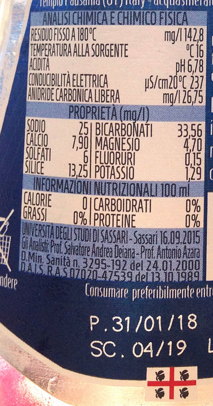 Barcode EAN:   8005463001375 Source altitude mt:   Temperature at the source °C:   16 Hardness:   Elecrical power ms/cm 20/25°:   237 Nitrate NO3mg/l:   Clorure Clmg/l:   Sodium Na1mg/l:   25 Magnesium Mg2mg/l:   4.7 Fluorine Fmg/l:   0.15 Free carbon dioxide at the source CO2mg/ll:   126.75 Price €:   Last update:   2024-03-10 15:45:52 | Brand:   Year analisys:   2015 Total dissolved solids mg/L at 180°:   142.8 pH at source:   6.78 Oxidability O2mg/l:   Bicarbonate HCO3mg/l:   33.56 Sulphate SO4mg/l:   6 Calcium Ca2mg/l:   7.9 Potassium K1mg/l:   1.29 Silica SiO2mg/l:   13.25 Country:   Italy Bought here:   |
