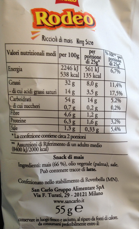 Barcode EAN:   8003130341298 Energy kcal/100g:   538 Satured Fat (per 100g)g:   14 Sugar into Carbohydrates (per 100g)g:   0.7 Proteines (per 100g)g:   6.3 Calcium CA/ mg (per 100g)g:   Gluten:   Production type:   Made in:   Italy Price €:   Last update:   2021-02-08 18:25:13 | Brand:   Fat (per 100g)g:   32 Carbohydrates (per 100g)g:   54 Fiber (per 100g)g:   4.6 Salt - Sodium (per 100g)g:   1.3 Ingredients (Indicative):   Bought here:   |