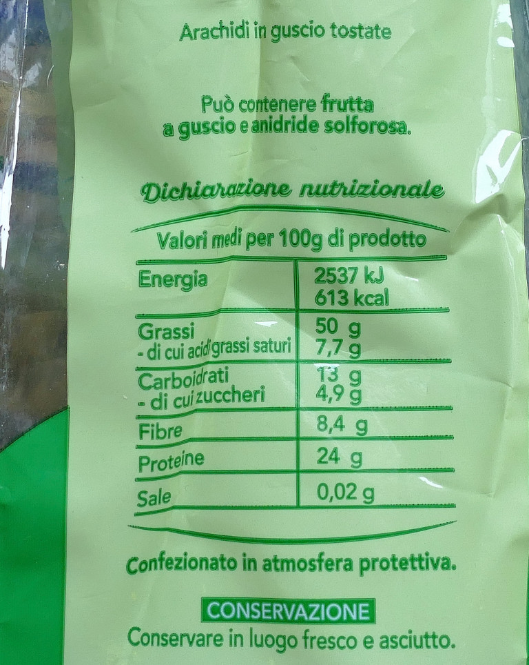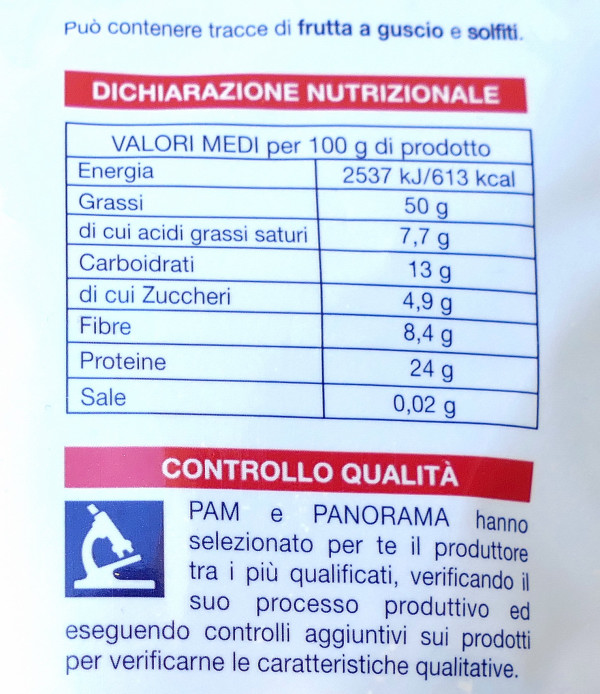 Barcode EAN:   8004263669037 Energy kcal/100g:   613 Satured Fat (per 100g)g:   7.7 Sugar into Carbohydrates (per 100g)g:   4.9 Proteines (per 100g)g:   24 Calcium CA/ mg (per 100g)g:   Gluten:   Made in:   Israel Bought here:   Last update:   2019-08-15 17:52:51 | Brand:   Fat (per 100g)g:   50 Carbohydrates (per 100g)g:   13 Fiber (per 100g)g:   8.4 Salt - Sodium (per 100g)g:   0.02 Ingredients (Indicative):   Production type:   Price €:   |