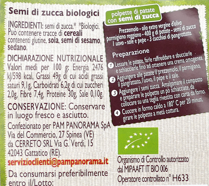 Barcode EAN:   8004263684030 Energy kcal/100g:   598 Satured Fat (per 100g)g:   9 Sugar into Carbohydrates (per 100g)g:   2 Proteines (per 100g)g:   30 Calcium CA/ mg (per 100g)g:   Gluten:   Made in:   Italy Bought here:   Last update:   2019-11-02 19:02:12 | Brand:   Fat (per 100g)g:   49 Carbohydrates (per 100g)g:   6.2 Fiber (per 100g)g:   7.4 Salt - Sodium (per 100g)g:   0.1 Ingredients (Indicative):   Production type:   Price €:   |