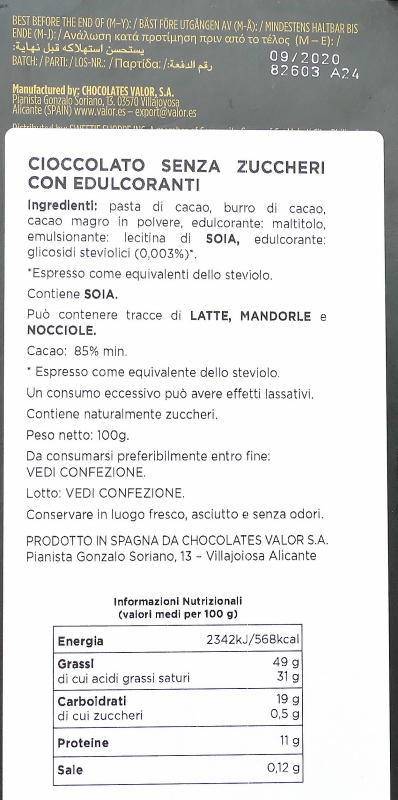 | "Descrizione" about VALOR - Sugars free 85% cacao supreme DARK 100G Review Consensus 7 by bitliner88 (1157 pt) | 2019-Nov-03 16:23 |