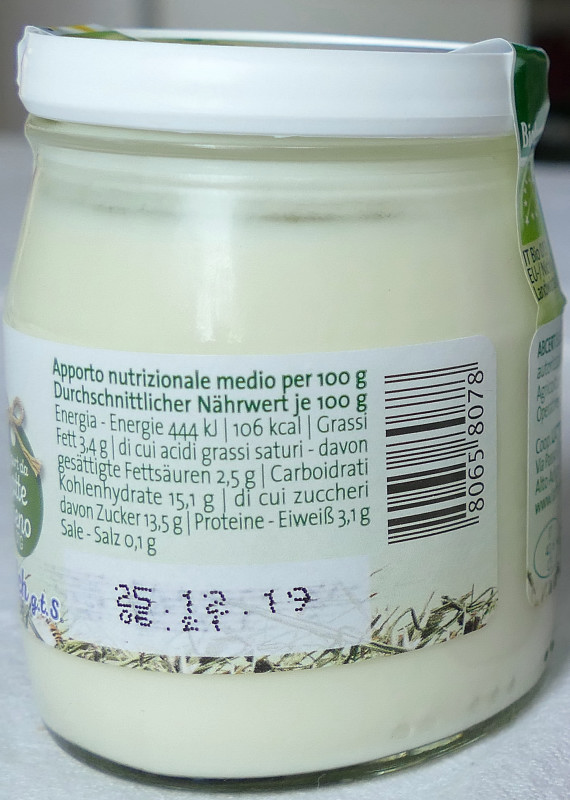 Barcode EAN:   80658078 Energy kcal/100g:   106 Satured Fat (per 100g)g:   2.5 Sugar into Carbohydrates (per 100g)g:   13.5 Proteines (per 100g)g:   3.1 Calcium CA/ mg (per 100g)g:   Gluten:   Production type:   Made in:   Italy Price €: