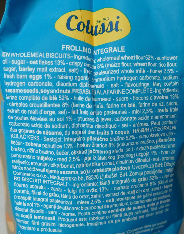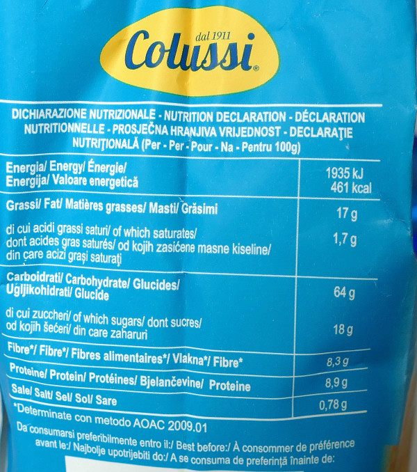 Barcode EAN:   8002590045234 Energy kcal/100g:   461 Satured Fat (per 100g)g:   1.7 Sugar into Carbohydrates (per 100g)g:   18 Proteines (per 100g)g:   8.9 Calcium CA/ mg (per 100g)g:   Gluten:   Production type:   Made in:   Italy Price €:   Bought here:   Last update:   2019-12-03 19:14:38 | Brand:   Fat (per 100g)g:   17 Carbohydrates (per 100g)g:   64 Fiber (per 100g)g:   8.3 Salt - Sodium (per 100g)g:   0.78 Ingredients (Indicative):   |