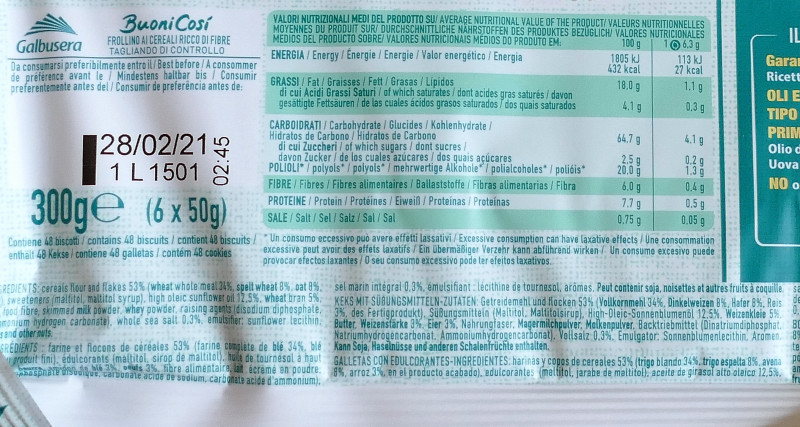 Barcode EAN:   8002190001807 Energy kcal/100g:   432 Satured Fat (per 100g)g:   4.1 Sugar into Carbohydrates (per 100g)g:   2.5 Proteines (per 100g)g:   7.7 Calcium CA/ mg (per 100g)g:   Gluten:   Production type:   Made in:   Italy Price €:   Bought here:   Last update:   2020-07-04 10:19:40 | Brand:   Fat (per 100g)g:   18 Carbohydrates (per 100g)g:   64.7 Fiber (per 100g)g:   6 Salt - Sodium (per 100g)g:   0.75 Ingredients (Indicative):   |
