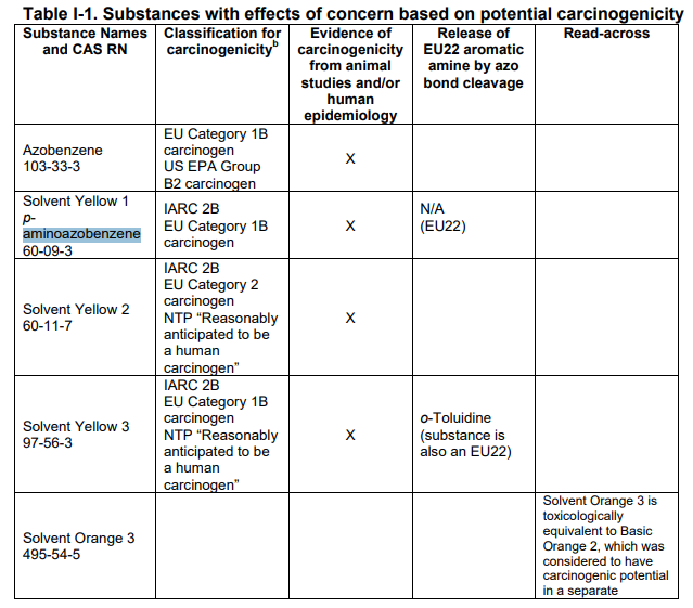 Synopsis. Pursuant to sections 68 or 74 of the Canadian Environmental Protection Act, 1999 (CEPA 1999), the Ministers of the Environment and of Health have conducted a screening assessment on 22 Azo Solvent Dyes. These substances constitute a subgroup of the Aromatic Azo and Benzidine-based Substance Grouping being assessed as part of the Groupings Initiative of Canada’s Chemicals Management Plan (CMP) based on structural similarity and applications. Substances in this grouping were identified as priorities for assessment as they met the categorization criteria under subsection 73(1) of CEPA 1999 and/or were considered as a priority based on other human health concerns. The Chemical Abstracts Service Registry Number (CAS RN)1, Domestic Substances List (DSL) name, and Colour Index (C.I) name or common name of the 22 substances are presented in the following table.....