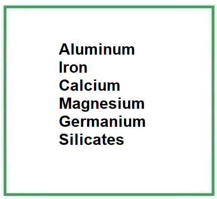 Aluminum IRON CALCIUM MAGNESIUM GERMANIUM SILICATES is an inorganic chemical compound, a ceramic powder consisting mostly of silicon dioxide, aluminium oxide, ferric oxide, calcium oxide, magnesium oxide and germanium oxide.