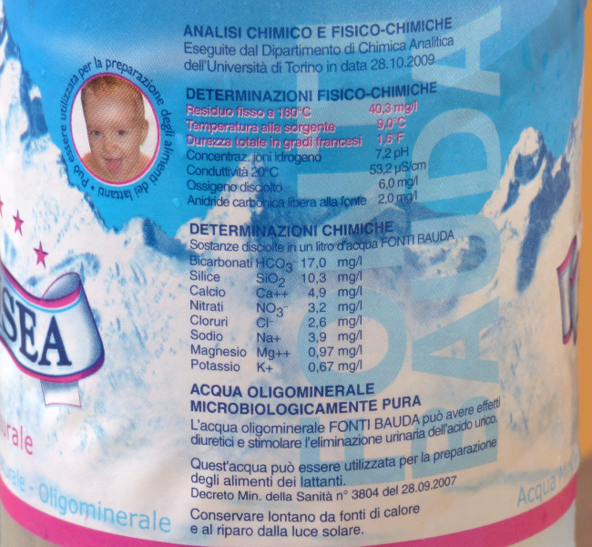 Barcode EAN:   8014215020106 Source altitude mt:   Temperature at the source °C:   15.1 Hardness:   4.4 Elecrical power ms/cm 20/25°:   88 Nitrate NO3mg/l:   0.9 Clorure Clmg/l:   3.7 Sodium Na1mg/l:   4 Magnesium Mg2mg/l:   2.3 Fluorine Fmg/l:   0.09 Free carbon dioxide at the source CO2mg/ll:   0.9 Price €:   Last update:   2022-08-17 15:56:57 | Brand:   Year analisys:   2018 Total dissolved solids mg/L at 180°:   56 pH at source:   8.26 Oxidability O2mg/l:   0.4 Bicarbonate HCO3mg/l:   42.7 Sulphate SO4mg/l:   5.7 Calcium Ca2mg/l:   12.3 Potassium K1mg/l:   0.5 Silica SiO2mg/l:   6.9 Country:   Italy Bought here:   |