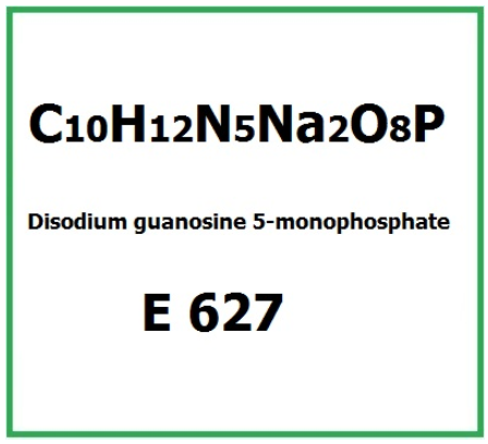 E627 or Disodium guanylate or Sodium 5'-guanylate or Disodium guanosine 5-monophosphate is a chemical compound. The general structure of guanosine monophosphate consists of a guanine base, a ribose sugar, and a phosphate group. In the case of disodium guanylate, two sodium ions are associated with the phosphate group, balancing its negative charge.